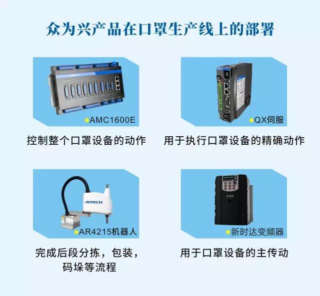 鑒于此,眾為興急行業(yè)之所急,在推出“設(shè)備免費用”活動基礎(chǔ)上,經(jīng)過深研生產(chǎn)加工工藝,又及時制定出了醫(yī)用口罩自動化生產(chǎn)線運動控制解決方案,能幫助設(shè)備商或集成商完成快速部署。