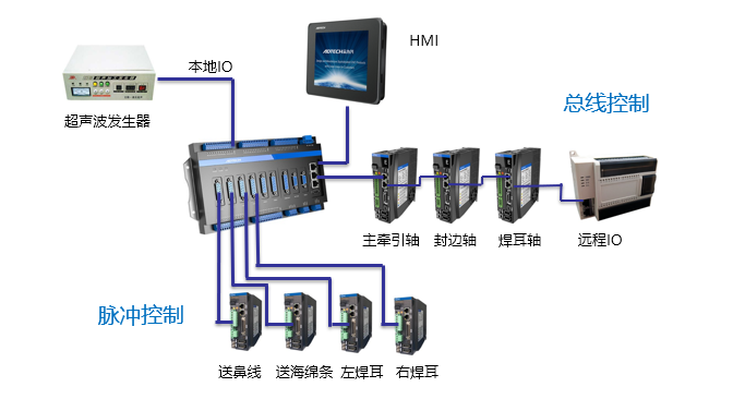 述生產(chǎn)線中,1臺口罩本體機(jī)需搭配2-3臺全自動內(nèi)/外耳帶口罩機(jī),產(chǎn)能可達(dá)到120片/分鐘以上,即0.5秒/片,而整條生產(chǎn)線要想實現(xiàn)性能穩(wěn)定、產(chǎn)量高、不良率低、易于操作,和運動控制性能可謂密不可分。