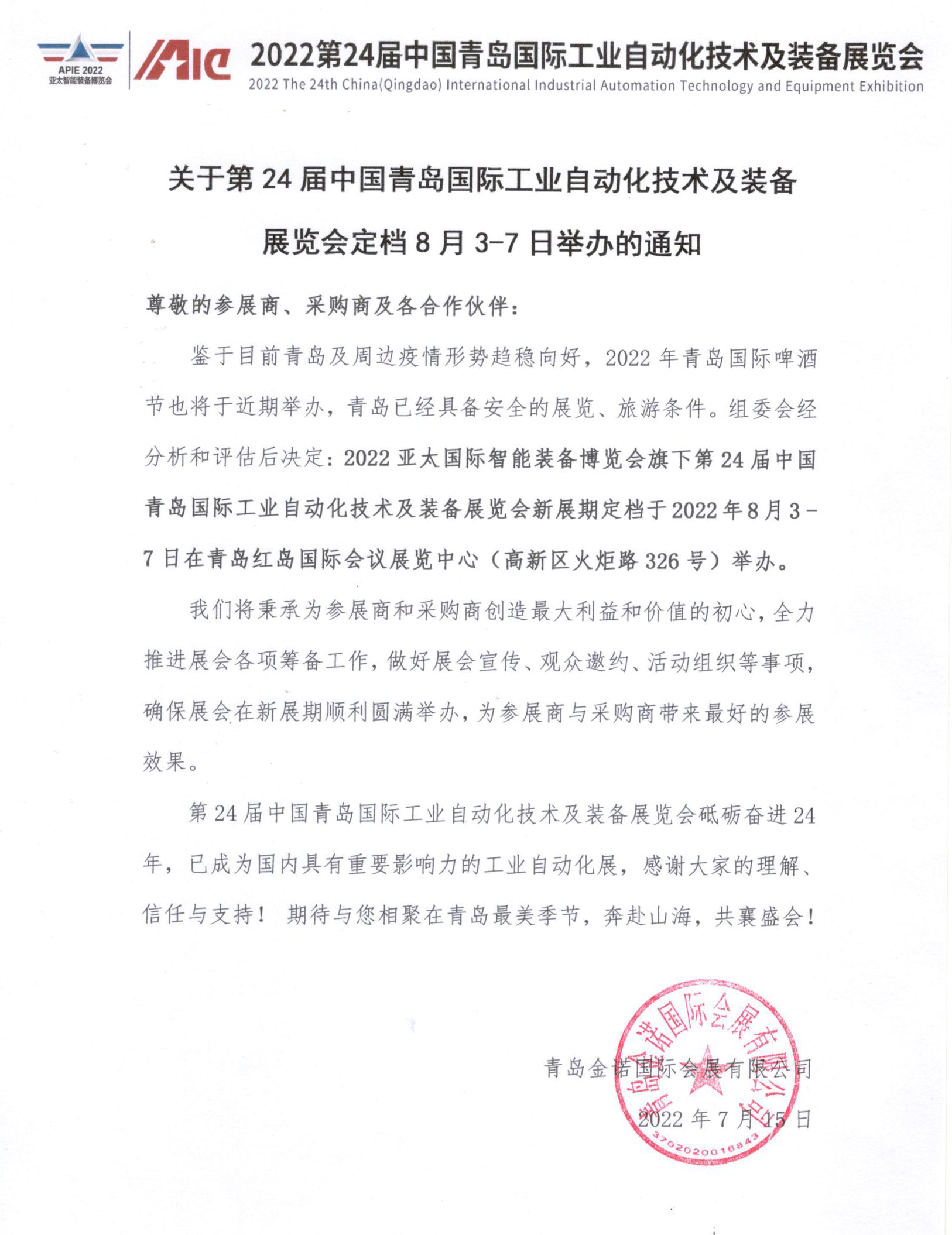關(guān)于第24屆中國青島國際工業(yè)自動(dòng)化技術(shù)及裝備展覽會(huì)延期舉辦的通知