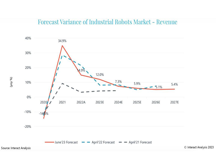Interact Analysis最近發(fā)布了工業(yè)機(jī)器人市場的最新預(yù)測,與2022年版本的報告相比,這是最重大的修訂。市場情報專家預(yù)計(jì),從2023年開始,短期內(nèi)投資信心將持續(xù)低迷,導(dǎo)致最終用戶推遲對工業(yè)機(jī)器人項(xiàng)目的大規(guī)模資本投資。從長遠(yuǎn)來看,新的電動汽車生產(chǎn)線和內(nèi)部物流等服務(wù)行業(yè)的需求將進(jìn)一步推動市場,導(dǎo)致平均增長率達(dá)到5-7%,遠(yuǎn)高于疫情爆發(fā)前的水平。