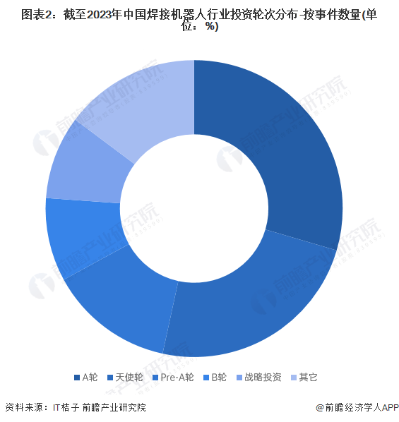 從焊接機(jī)器人市場(chǎng)的投融資輪次分析,焊接機(jī)器人行業(yè)的融資輪次主要集中在A輪、天使輪、Pre-A輪等環(huán)節(jié),早期融資事件相對(duì)較多,另外也有少數(shù)C輪、D輪等中晚期投融資事件。