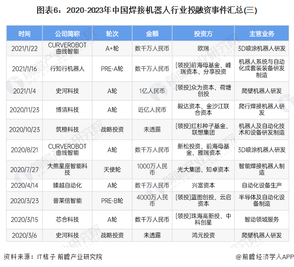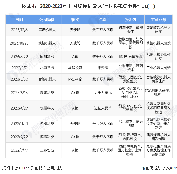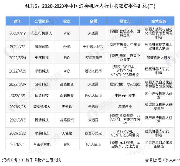 2020-2023年我國(guó)焊接機(jī)器人行業(yè)的主要投融資事件如下: