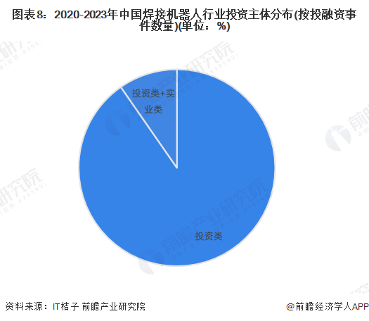 根據(jù)對(duì)焊接機(jī)器人行業(yè)投資主體的總結(jié),目前我國(guó)焊接機(jī)器人行業(yè)的投資主體主要以投資類(lèi)企業(yè)為主,相關(guān)事件數(shù)量占比九成左右,代表性投資主體有IDG資本、Atypical Ventures等,而實(shí)業(yè)類(lèi)的投資主體相對(duì)較少。