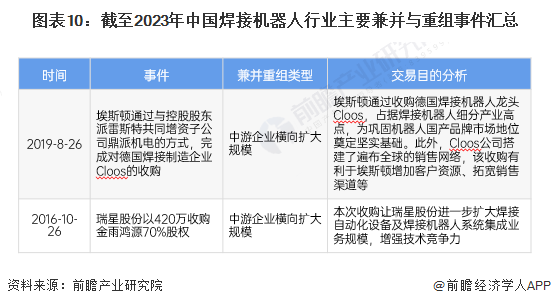 近年來(lái),中國(guó)焊接機(jī)器人行業(yè)的兼并重組事件減少,兼并重組的類(lèi)型主要為中游企業(yè)橫向擴(kuò)大規(guī)模和提升技術(shù)競(jìng)爭(zhēng)水平。