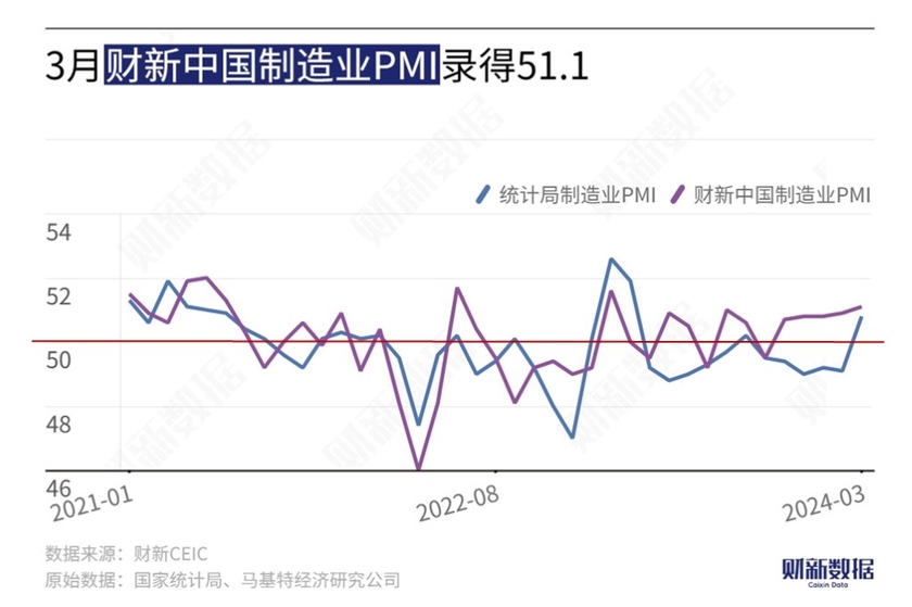 隨著春節(jié)后快速復(fù)工復(fù)產(chǎn)、市場活躍度回升,中國制造業(yè)擴張速度加快。4月1日公布的3月財新中國制造業(yè)采購經(jīng)理指數(shù)(PMI)錄得51.1,高于2月0.2個百分點,已連續(xù)五個月位于擴張區(qū)間,創(chuàng)2023年3月來新高,顯示制造業(yè)生產(chǎn)經(jīng)營活動加速向好。此前一日,國家統(tǒng)計局公布的3月制造業(yè)PMI錄得50.8,較前值上升1.7個百分點,2023年10月以來首次高于榮枯線。